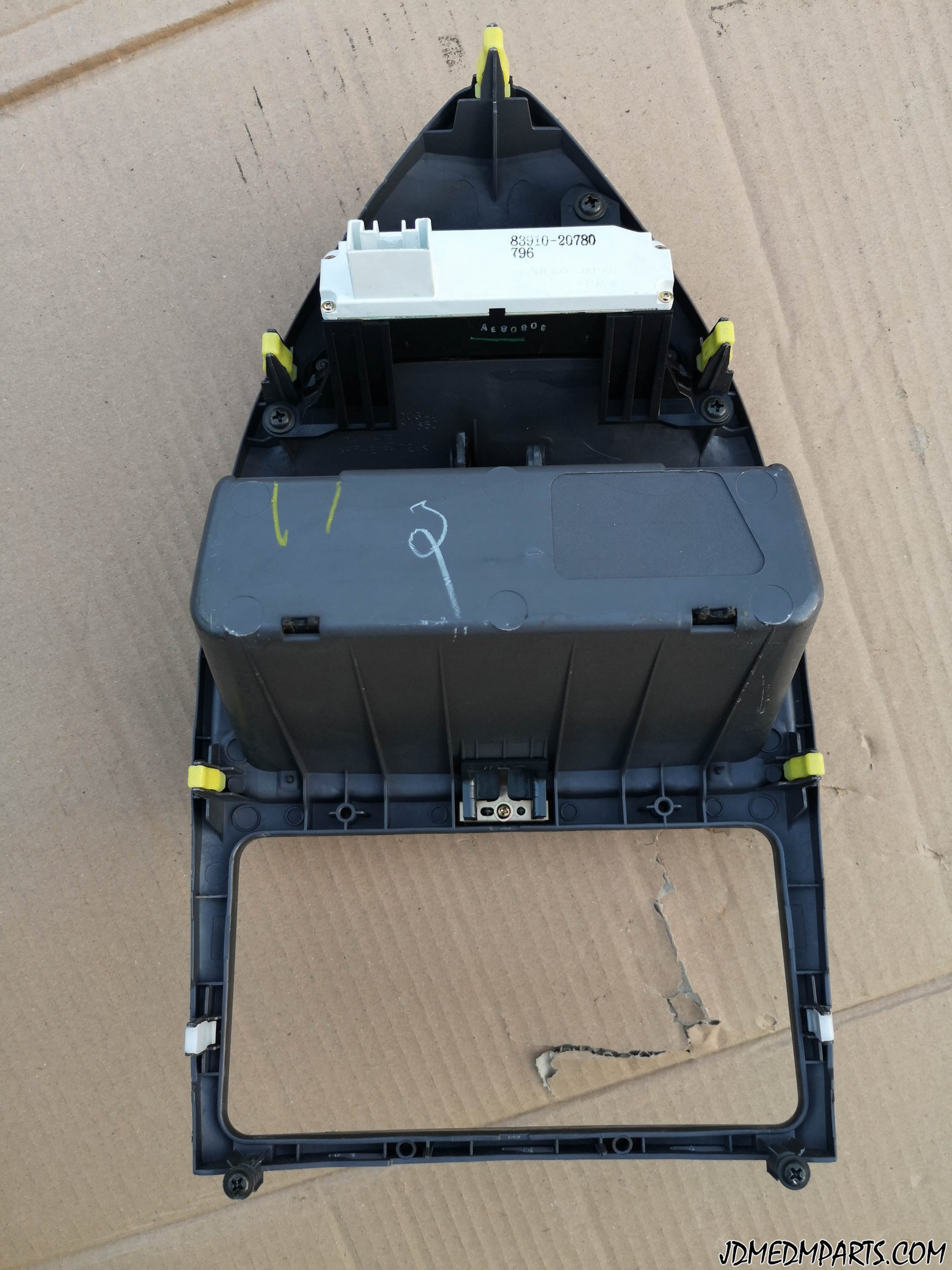 This is a 2003+ (facelift) dark gray Toyota Celica GT GTS center dash radio trim bezel with ORANGE light clock (83910-20780) and storage box.
